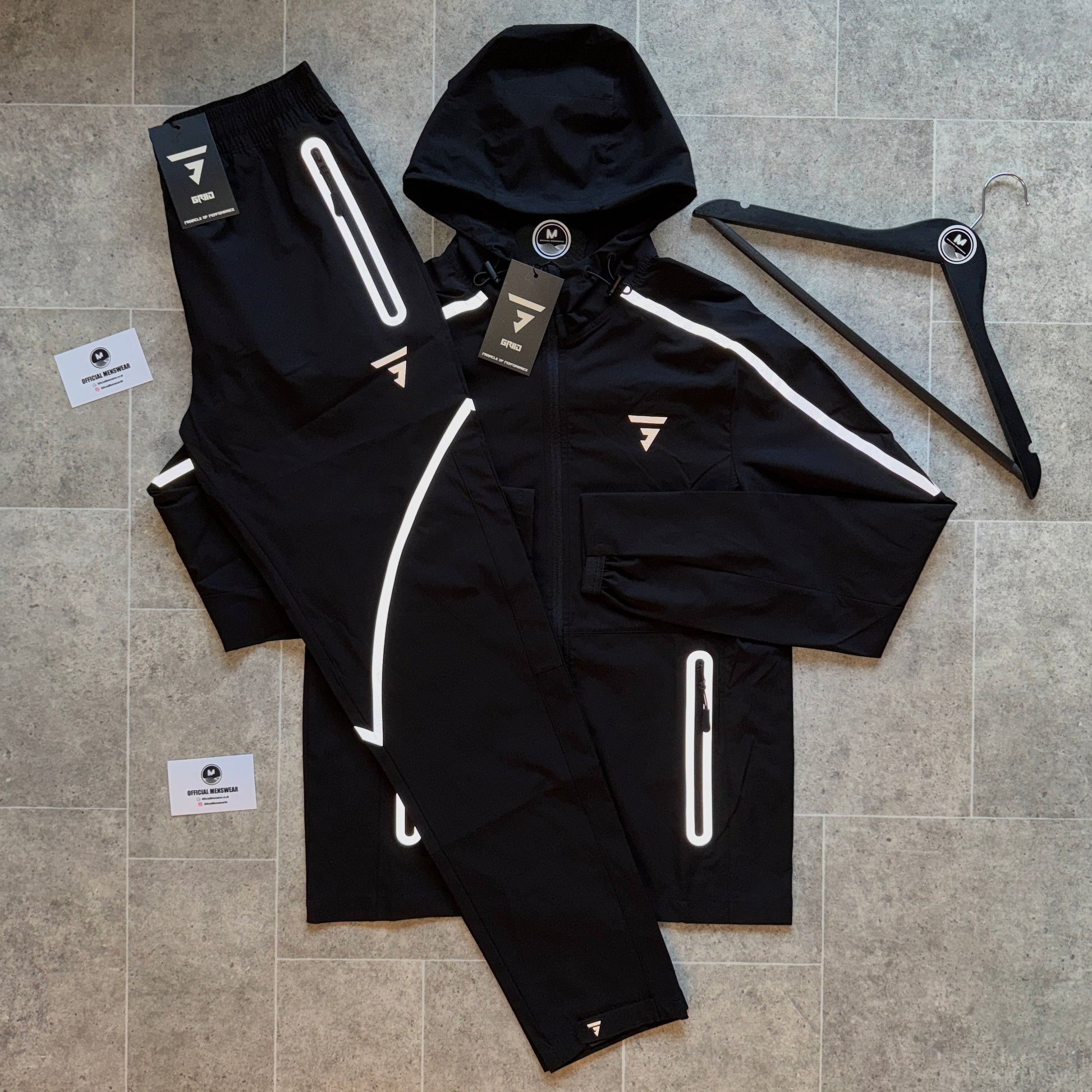 Griid Reflect Tracksuit in Black. Reflecting on a job well done, Griid gets to work on re-inventing your streetwise casual attire, starting with this full zip hoodie. Made from lightweight breathable woven polyester fabric, the front zip fastening and 2 secure zip pockets both feature eye-catching zipper pullers, mirrored by the adjustable toggles to the hood. With contrast panels and reflective Griid left chest logo and accents ensuring your visibility is increased in those pesky low light conditions. Standard fit.